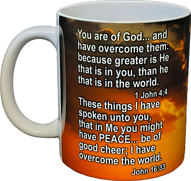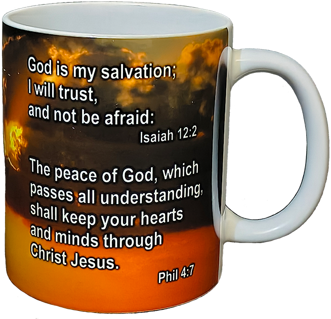 The Bible Verses featured on this mug carry themes of RESTING in the LORD, OVERCOMING FEAR, TRUST and SALVATION from both the Old and New Testament, from John the Apostle, the Prophet Isaiah and the Letter from Paul to the Philippians [1 John 4:4, John 16:33, Isaiah 12:2 and Phil 4:7]. They are a constant reminder of God’s Promises and Direction for your life, to contemplate during those quiet times of meditation as you start your day.